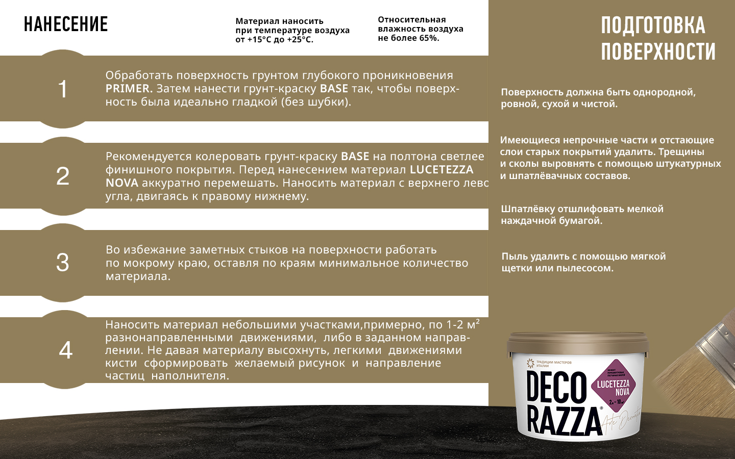 8. Материал наносить при температуре воздуха 15-25 °С и относительной влажности воздуха не более 65%.