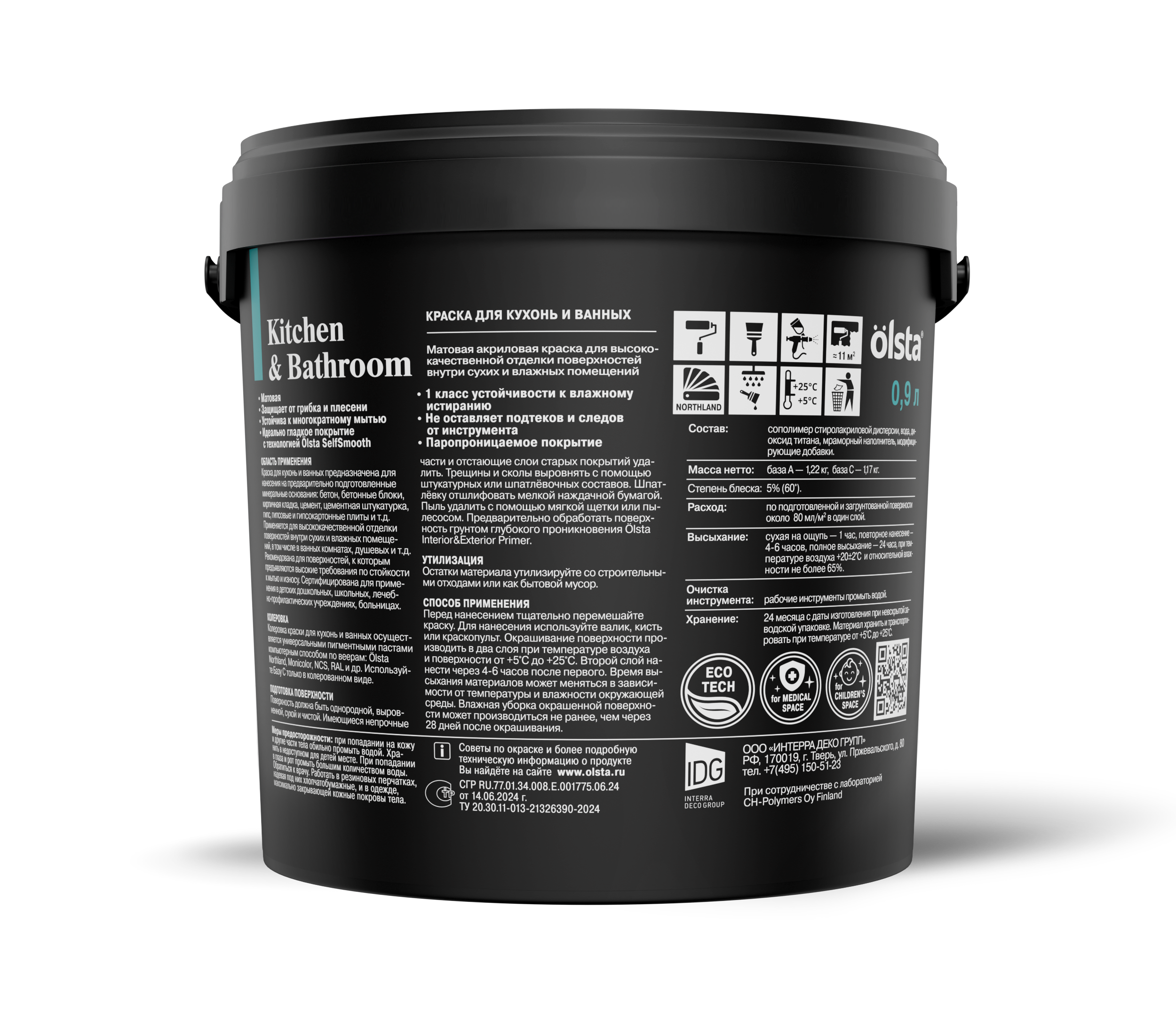 Моющаяся краска Olsta Kitchen & Bathroom формирует на кухнях и в ванных комнатах влагостойкое ультрапрочное покрытие без подтеков. Водно-дисперсионная краска на основе латекса легко очищается от загрязнений, предотвращает риск появления плесневого грибка, устойчива к влажной уборке с бытовыми моющими средствами. Подходит для окрашивания стен и потолков.