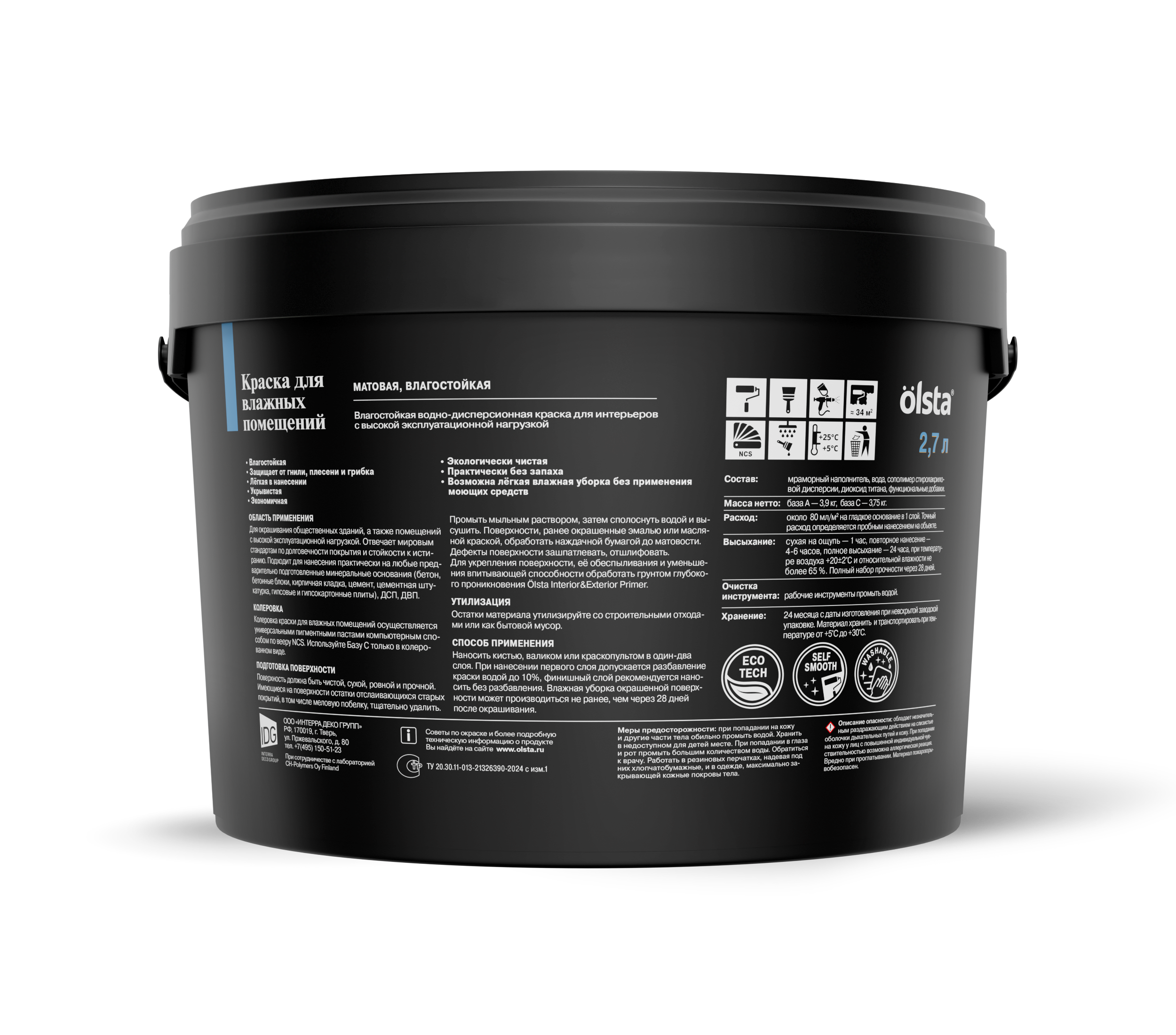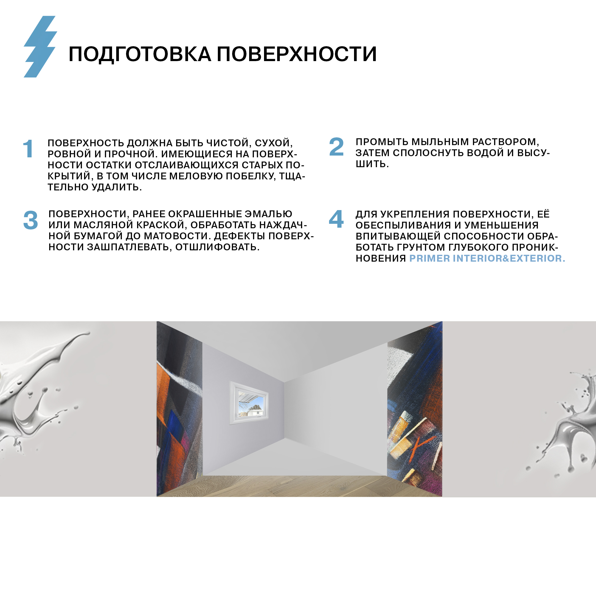 Поверхность должна быть чистой, сухой, ровной и прочной. Имеющиеся на поверхности остатки отслаивающихся старых покрытий, в том числе меловую побелку, тщательно удалить. Промыть мыльным раствором, затем сполоснуть водой и высушить. Поверхности, ранее окрашенные эмалью или масляной краской, обработать наждачной бумагой до матовости. Дефекты поверхности зашпатлевать, отшлифовать. Для укрепления поверхности, её обеспыливания и уменьшения впитывающей способности обработать грунтом глубокого проникновения Olsta Interior&Exterior Primer.