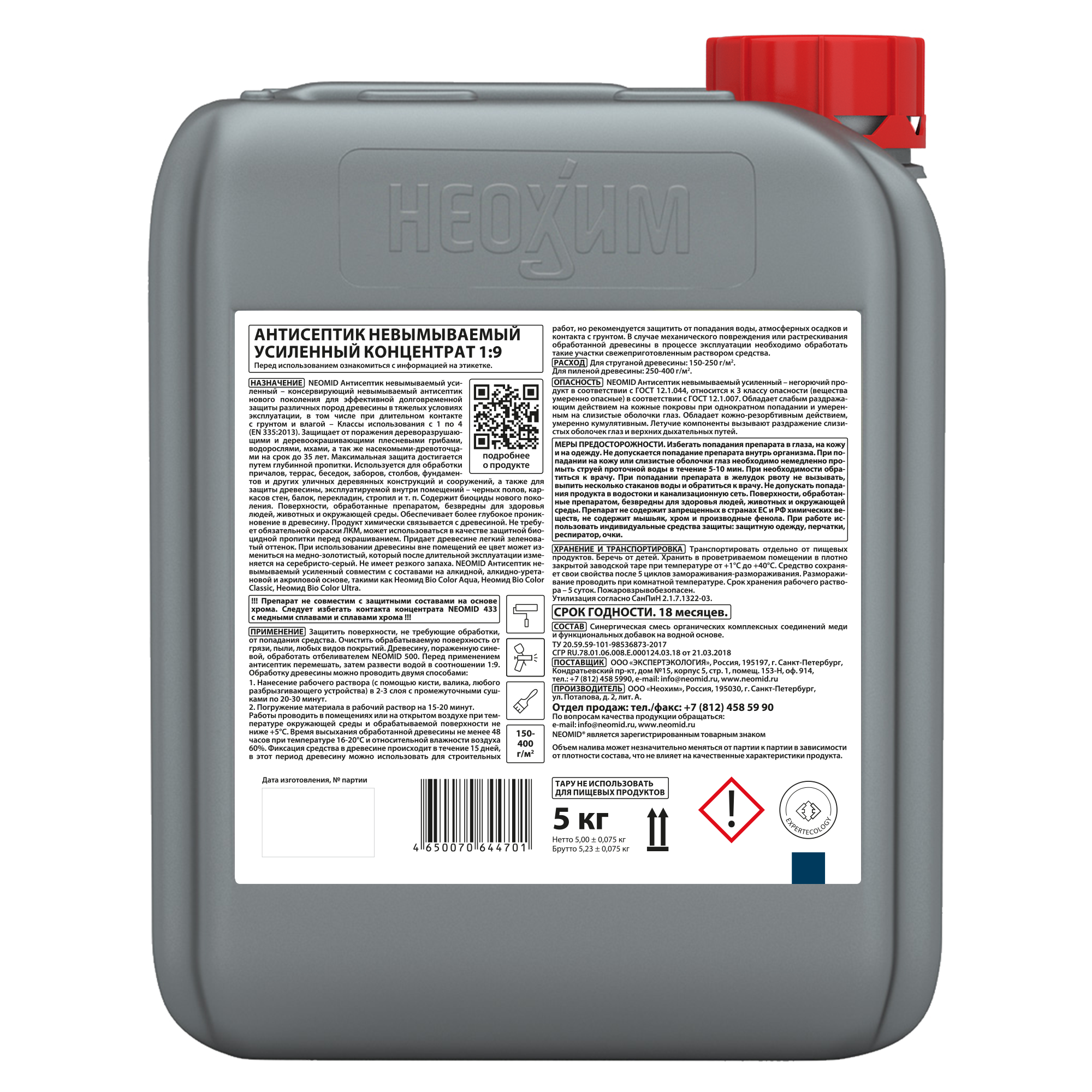 NEOMID Антисептик Невымываемый Усиленный – негорючий продукт в соответствии с ГОСТ 12.1.044, относится к 3 классу опасности (вещества умеренно опасные) в соответствии с ГОСТ 12.1.007. Обладает слабым раздражающим действием на кожные покровы при однократном попадании и умеренным на слизистые оболочки глаз. Обладает кожно-резорбтивным действием, умеренно кумулятивным. Летучие компоненты вызывают раздражение слизистых оболочек глаз и верхних дыхательных путей.