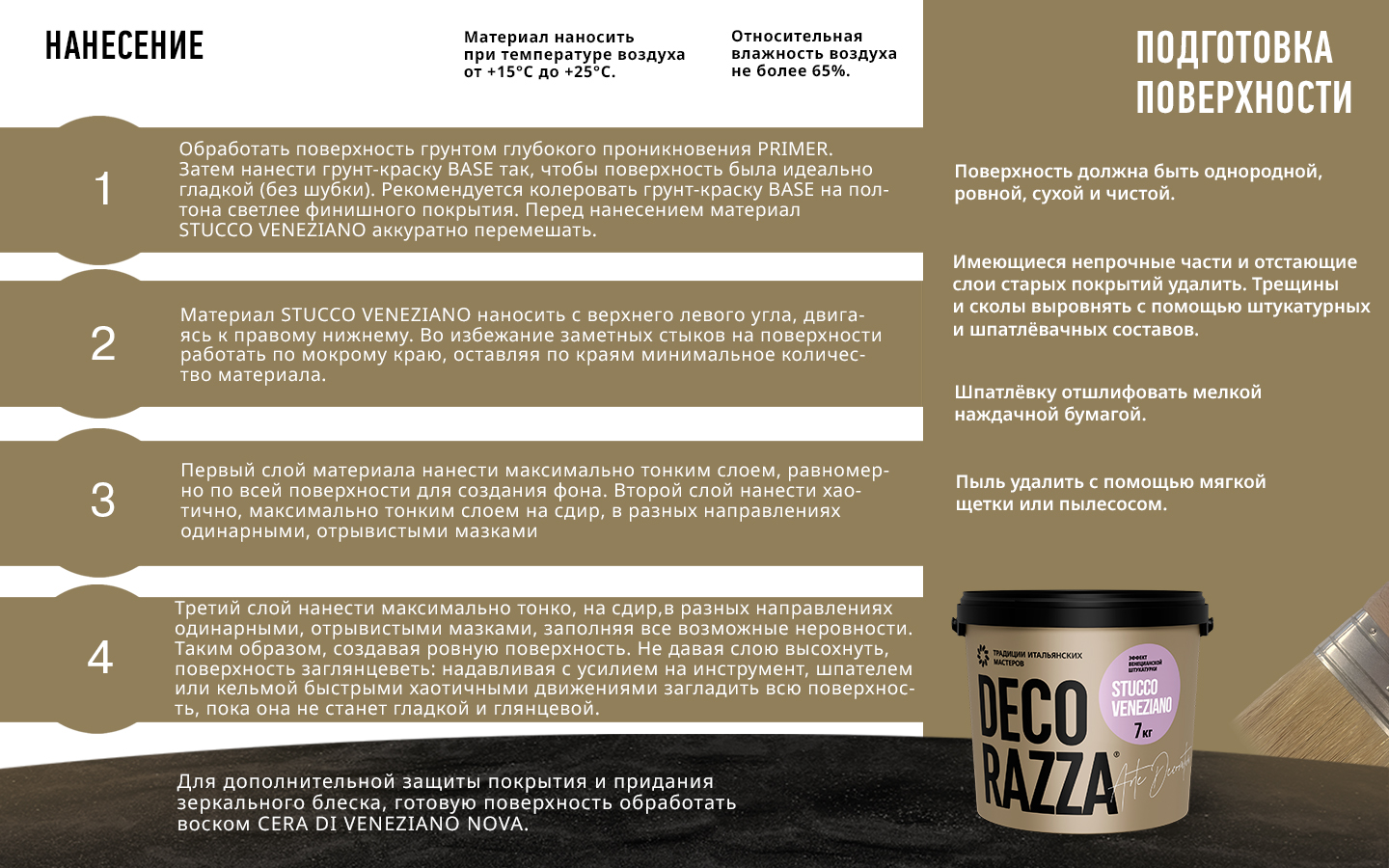 Экологичная венецианская штукатурка с мраморным наполнителем и восковыми добавками Stucco Veneziano создана для формирования роскошных декоров в гостиных, спальнях, холлах и прочих помещениях с нормальной эксплуатационной нагрузкой. Подходит для использования как в классических дворцовых стилях, так и в современных интерьерах при сочетании с другими материалами бренда Decorazza. После обработки воском покрытие приобретает устойчивость к влажной уборке, полировка позволяет сформировать глянцевую или зеркальную поверхность. Расход венецианки зависит от способа нанесения, в среднем составляет 0,3–0,5 кг/м2.