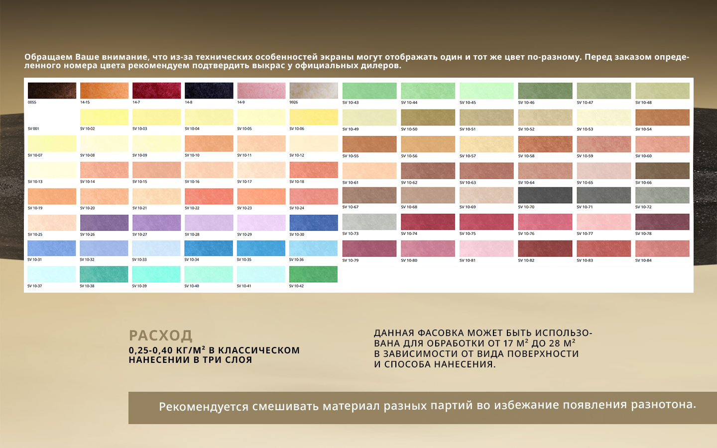 при температуре окружающей среды +22°С и относительной влажности не более 65 %: Грунт глубокого проникновения Primer 2-3 часа. Грунт-краска Base 6-12 часов. Декоративное покрытие Stucco Veneziano межслойная выдержка 6 часов, полное высыхание через 24 часа влажная уборка не ранее, чем через 28 дней. Время высыхания материалов может меняться в зависимости от температуры и влажности окружающей среды. |